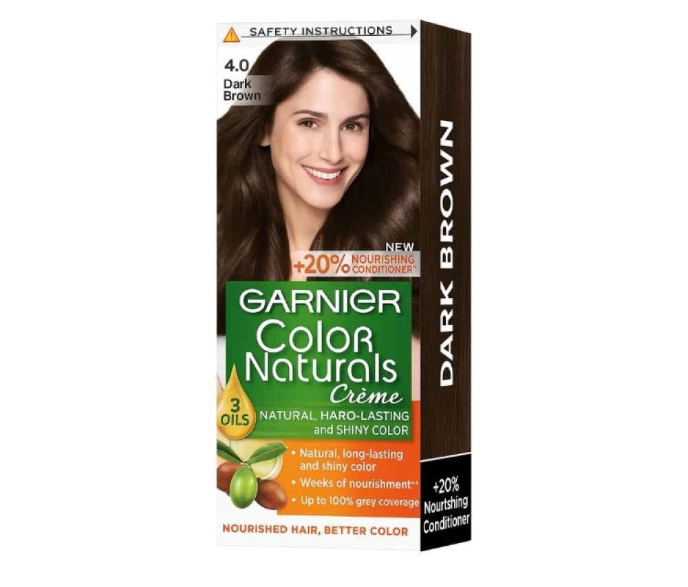 Garnier Color Naturals Crème Hair Color in 4.0 Dark Brown gives your hair a rich, deep color with a natural, long-lasting finish. Its nourishing formula, enriched with three natural oils, helps moisturize and protect hair, leaving it with a healthy shine and soft texture, while providing 100% gray coverage.